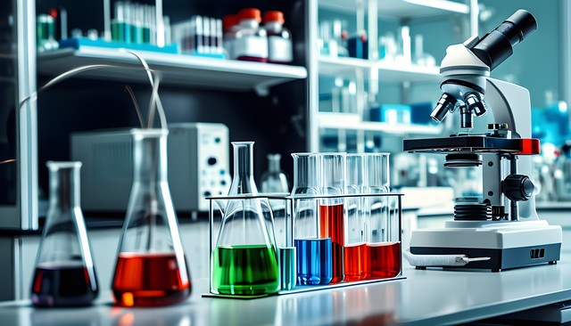 实验室桌面上的显微镜和多种颜色的液体瓶,科技感十足。