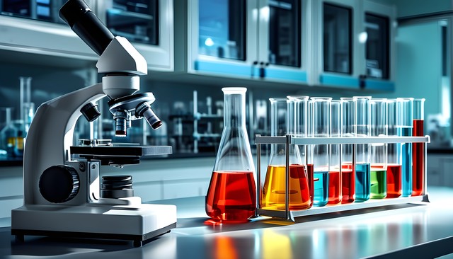 实验室桌面上的显微镜和多种颜色的液体瓶,科技感十足。