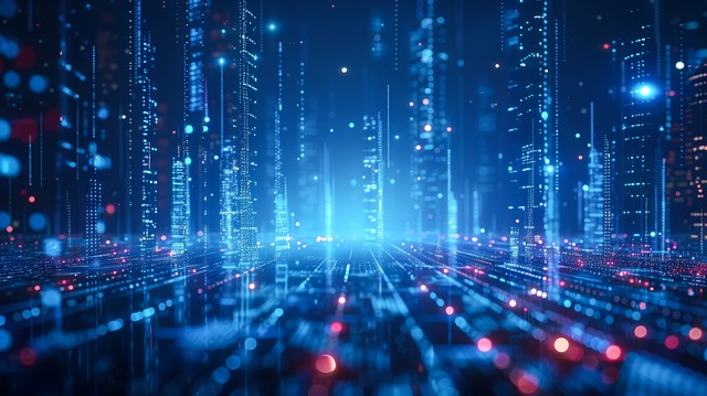 抽象发光蓝色数字化科技城市,未来主义城市灯光和流动的数据信息,数字技术概念科技科学大数据互联网背景