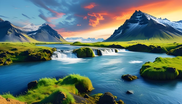 壮丽的山脉与宁静的河流交织在一起,展现出大自然的和谐美景。