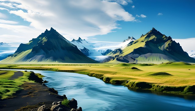 壮丽的山脉与宁静的河流交织在一起,展现出大自然的和谐美景。