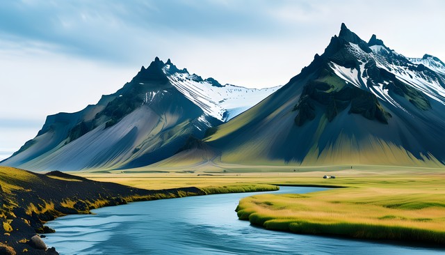 壮丽的山脉与宁静的河流交织在一起,展现出大自然的和谐美景。