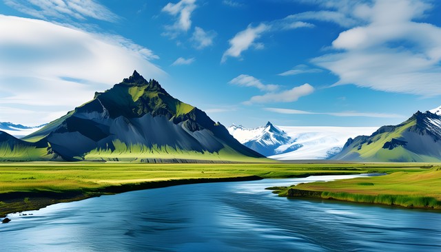 壮丽的山脉与宁静的河流交织在一起,展现出大自然的和谐美景。
