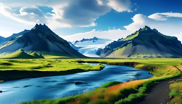 壮丽的山脉与宁静的河流交织在一起,展现出大自然的和谐美景。
