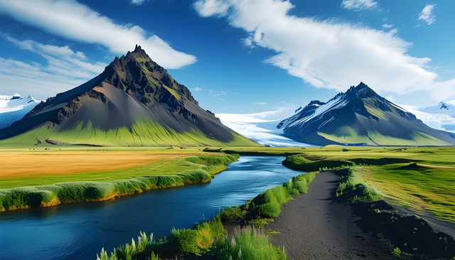 壮丽的山脉与宁静的河流交织在一起,展现出大自然的和谐美景。