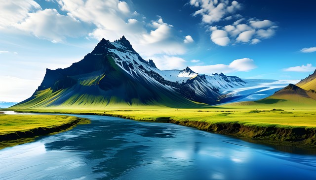 壮丽的山脉与宁静的河流交织在一起,展现出大自然的和谐美景。