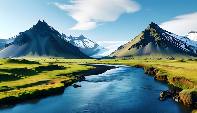 壮丽的山脉与宁静的河流交织在一起,展现出大自然的和谐美景。