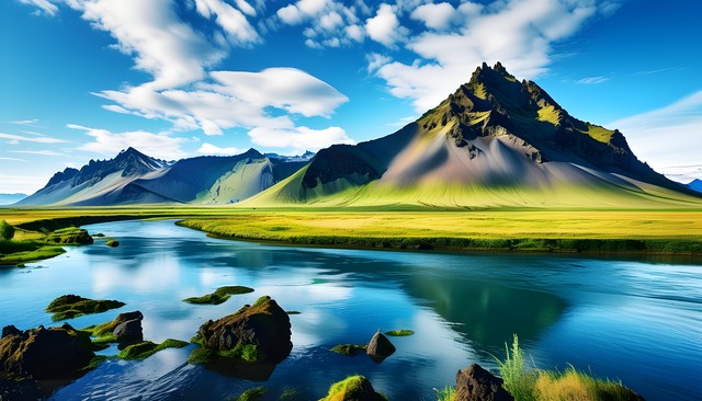 壮丽的山脉与宁静的河流交织在一起,展现出大自然的和谐美景。