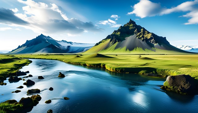 壮丽的山脉与宁静的河流交织在一起,展现出大自然的和谐美景。