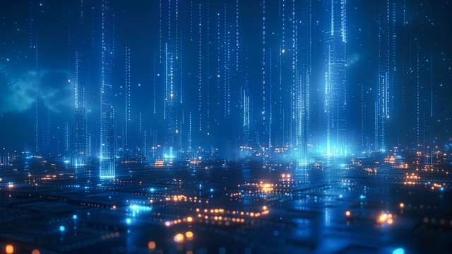 抽象发光蓝色数字化科技城市,未来主义城市灯光和流动的数据信息,数字技术概念科技科学大数据互联网背景