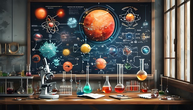 充满能量的原子结构与星球,体现科学与宇宙的关系。