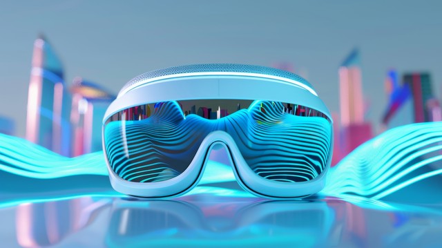 一副VR眼镜在城市中心广场倒映元宇宙全息虚拟现实都市网络空间的概念科技背景白天