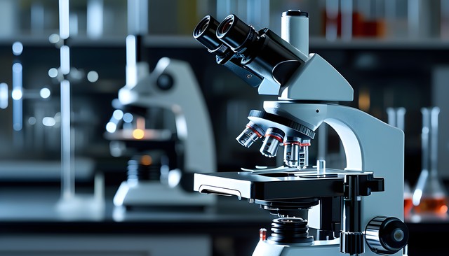 显微镜与试管的实验室场景,展示科研氛围。