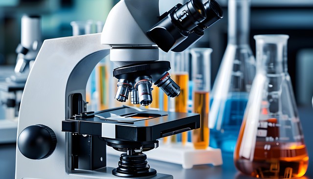 显微镜与试管的实验室场景,展示科研氛围。