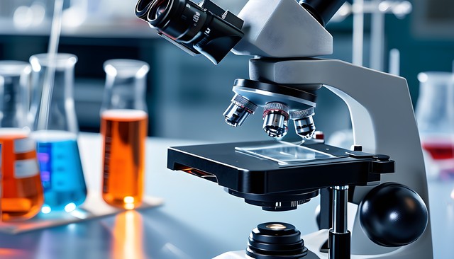 显微镜与试管的实验室场景,展示科研氛围。