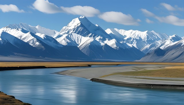 雪山与水流交融的壮丽景色,展现出自然的雄伟与宁静。