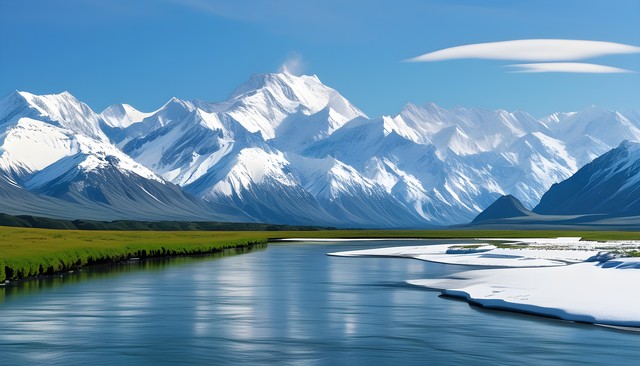 雪山与水流交融的壮丽景色,展现出自然的雄伟与宁静。