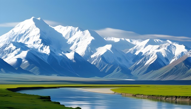 雪山与水流交融的壮丽景色,展现出自然的雄伟与宁静。