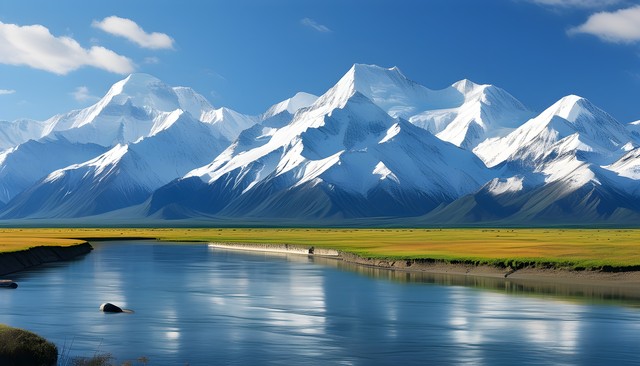 雪山与水流交融的壮丽景色,展现出自然的雄伟与宁静。