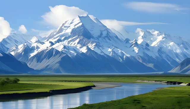 雪山与水流交融的壮丽景色,展现出自然的雄伟与宁静。