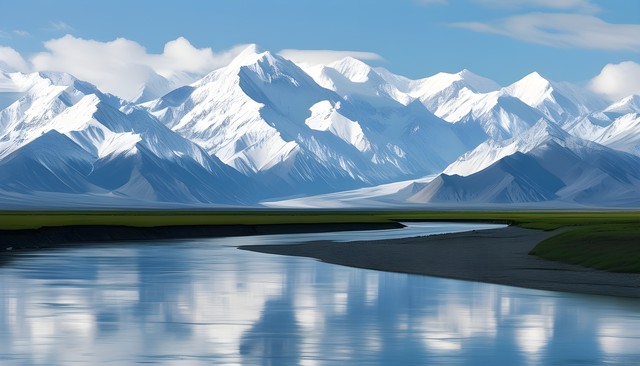 雪山与水流交融的壮丽景色,展现出自然的雄伟与宁静。
