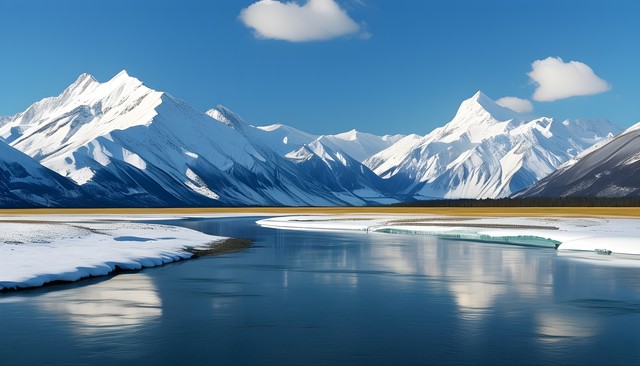 雪山与水流交融的壮丽景色,展现出自然的雄伟与宁静。