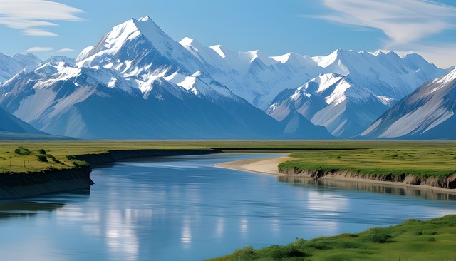 雪山与水流交融的壮丽景色,展现出自然的雄伟与宁静。