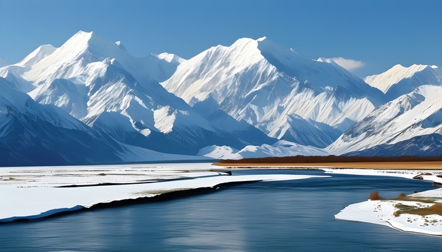 雪山与水流交融的壮丽景色,展现出自然的雄伟与宁静。