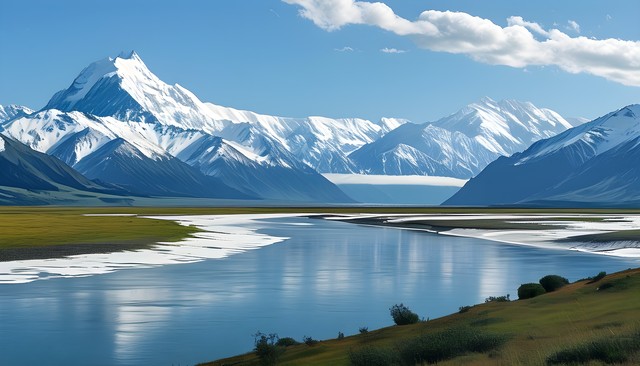 雪山与水流交融的壮丽景色,展现出自然的雄伟与宁静。