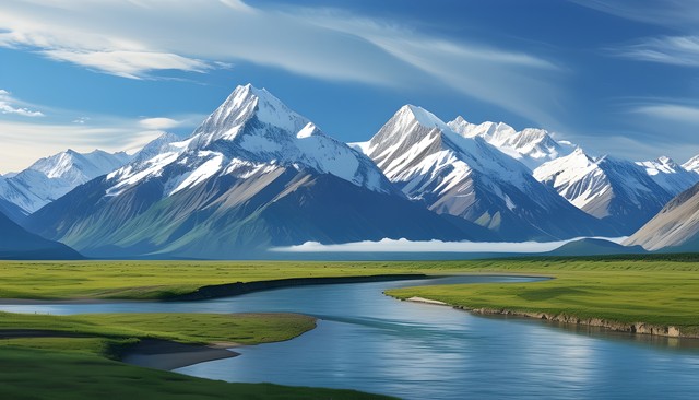 雪山与水流交融的壮丽景色,展现出自然的雄伟与宁静。
