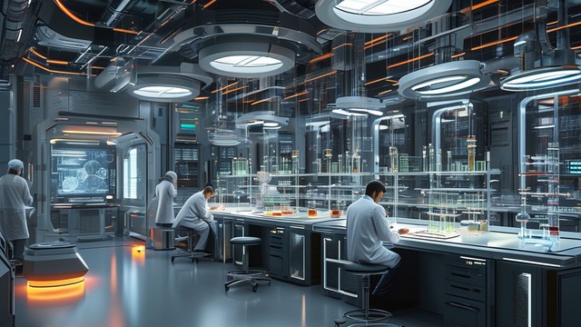 未来感十足的实验室,高科技设备环绕,科学家专注研究。