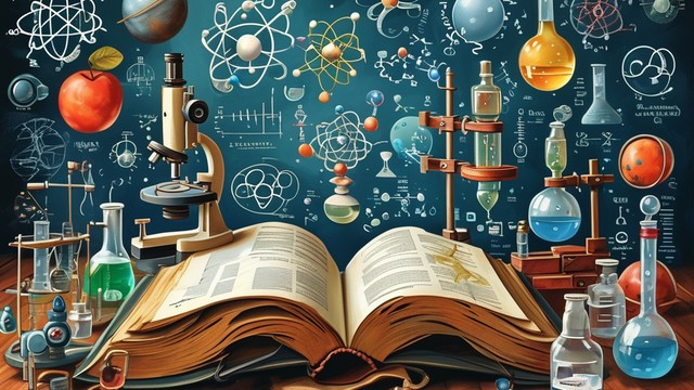 一本打开的书籍,周围环绕着各种科学仪器和图表,象征着教育与科学的结合。