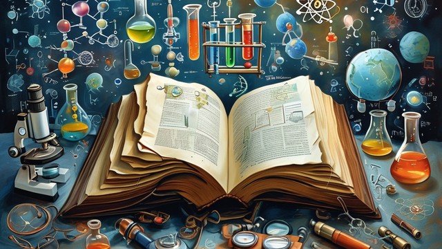 一本打开的书籍,周围环绕着各种科学仪器和图表,象征着教育与科学的结合。