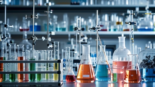 实验室中,科学家正专注地进行化学实验,各种仪器排列整齐,灯光柔和。