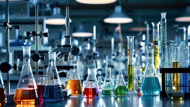 实验室中,科学家正专注地进行化学实验,各种仪器排列整齐,灯光柔和。