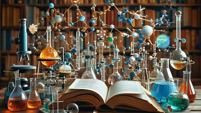 一本打开的书籍,周围环绕着各种科学仪器,象征着教育与科学的结合。