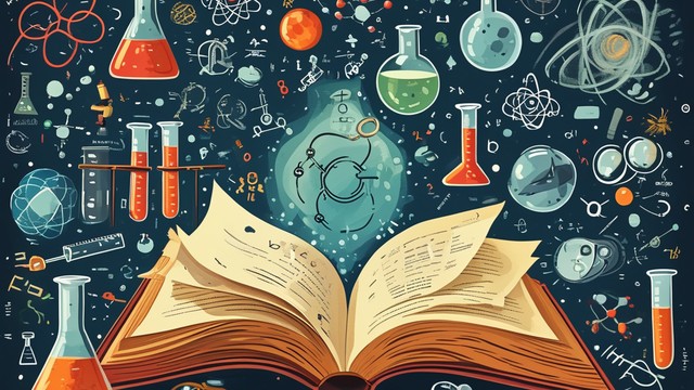 画面展示一本打开的科学书籍,周围环绕着各种科学符号和实验器材,象征着知识的传播。
