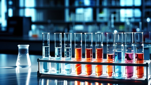 实验室中,试管排列整齐,化学试剂在灯光下闪耀,展现药学科学的严谨与创新。