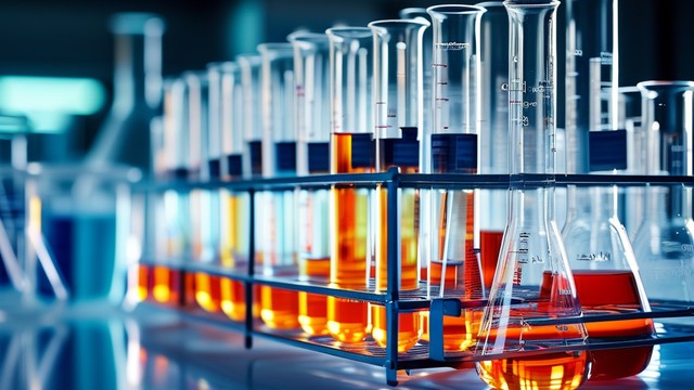实验室中,试管排列整齐,化学试剂在灯光下闪耀,展现药学科学的严谨与创新。