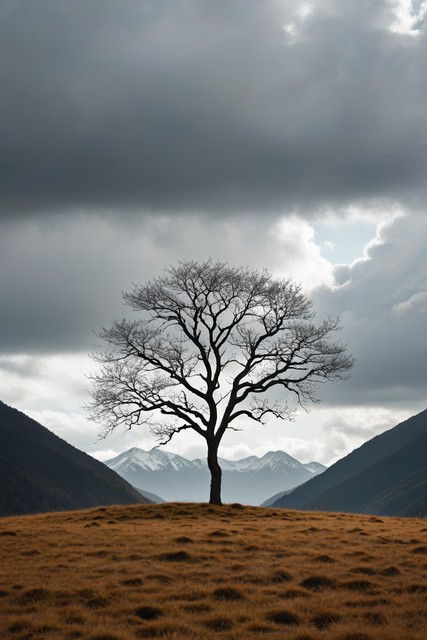一棵孤独的树矗立在一片背景是山脉的田野里风景风光高清图片