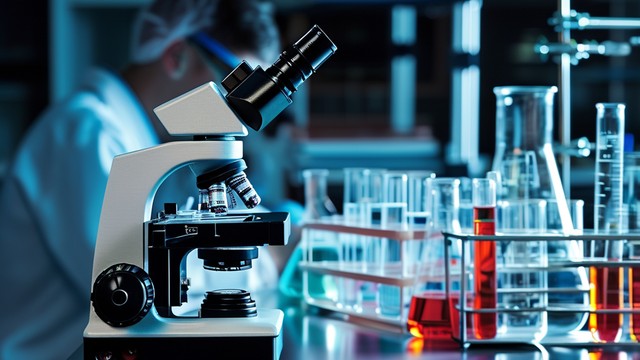 实验室中,科学家专注地进行实验,仪器排列整齐,显微镜下微观世界清晰可见。