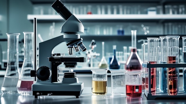 实验室中,科学家专注地进行实验,仪器排列整齐,显微镜下微观世界清晰可见。
