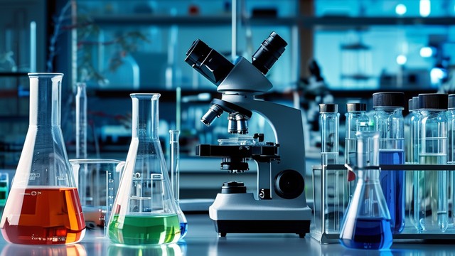 实验室中,科学家专注地进行实验,仪器排列整齐,显微镜下微观世界清晰可见。