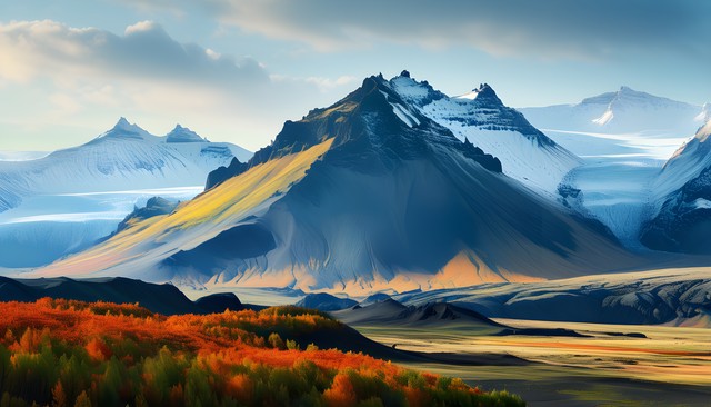高耸入云的山峰与广阔的秋季色彩相映成趣,展现自然的壮丽。