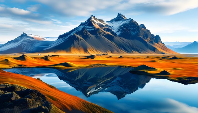 高耸入云的山峰与广阔的秋季色彩相映成趣,展现自然的壮丽。