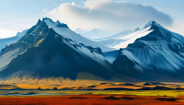 高耸入云的山峰与广阔的秋季色彩相映成趣,展现自然的壮丽。