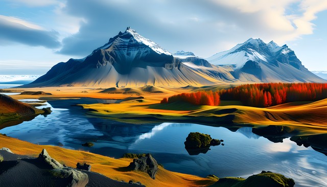 高耸入云的山峰与广阔的秋季色彩相映成趣,展现自然的壮丽。