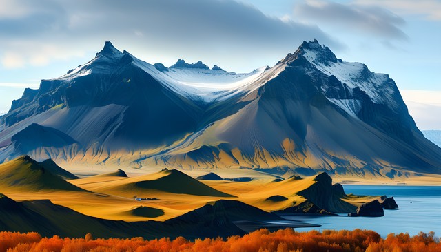 高耸入云的山峰与广阔的秋季色彩相映成趣,展现自然的壮丽。