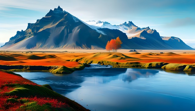 高耸入云的山峰与广阔的秋季色彩相映成趣,展现自然的壮丽。