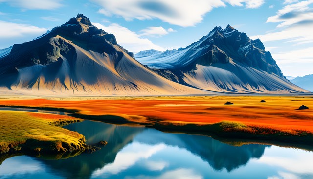 高耸入云的山峰与广阔的秋季色彩相映成趣,展现自然的壮丽。